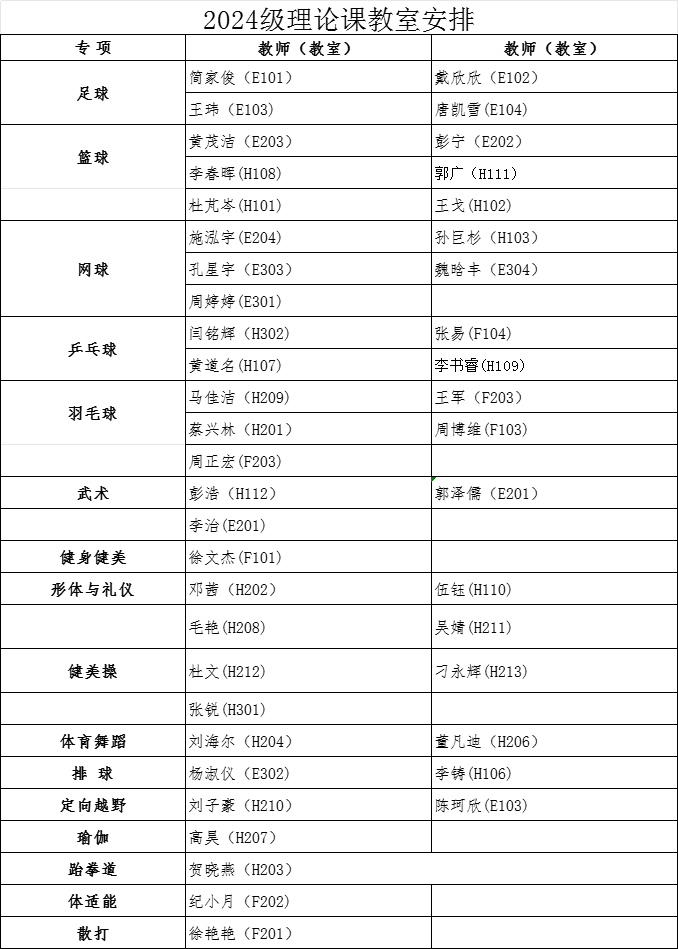 经教务处同意,本学期2024级本科生第1周体育课为九游在线(中国)理论课,9月15日起恢复户外教学。根据教室资源状况,现将理论课具体安排通知如下: