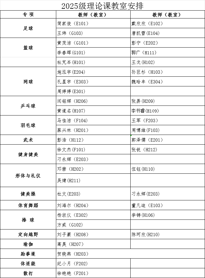 经教务处同意,本学期2024级、2025级本科生第13周体育课为九游在线(中国)理论课,12月8日起恢复户外教学。根据教室资源状况,现将理论课具体安排通知如下:
