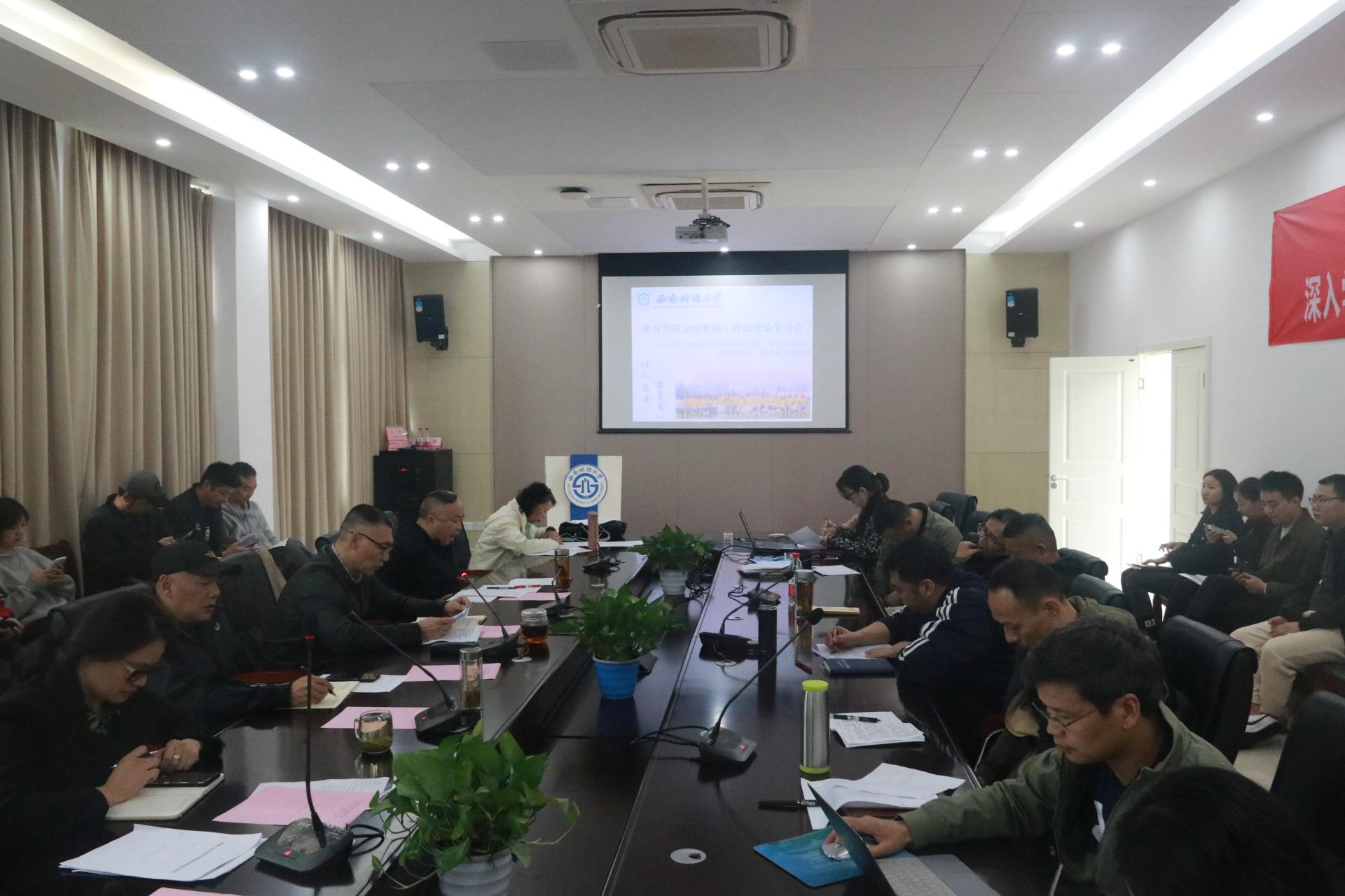 10月19日,九游在线在游泳池201会议室召开全体教职工政治理论学习会,深入学习贯彻中央财经委员会第十次会议精神、四川省委十一届九次全会精神。学院全体教职工参加,会议由杨远波院长主持。