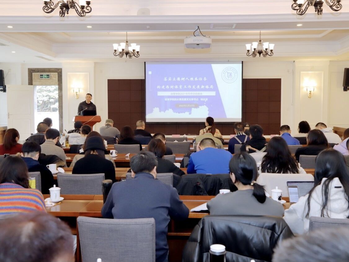 在随后召开的九游在线2021年年终总结会上,院长兼直属党支部书记杨远波就学院2021年度工作总结和2022年度工作思路及举措作报告。他指出,2021年是全面建成小康社会和“十四五”规划的开篇之年,也是实现第一个百年奋斗目标的决胜之年,全院教职工对学院各方面工作建设的辛勤付出和卓越贡献。2022年,学院要围绕贯彻落实学校第十三次党代会和第十三届二、三次党代会精神,深入推进党的建设,扎根中国大地,瞄准世界一流,聚力改革创新,将体育纳入全面实施素质教育的各项工作中,落实立德树人根本任务,持续深化“1+3”体育教育教学模式改革,全学段全覆盖开设体育课,通过“教会、勤练、常赛”,完善“四位一体”学生体质健康促进体系,深化体育综合评价机制改革,促进学生身心素质全面协调发展;做好大运会相关工作,加大智慧型体育场馆建设力度。面对新时代新征程新使命,自信自强、守正创新,全面加强和改进新时代学校体育工作,以优异成绩迎接党的二十大胜利召开。