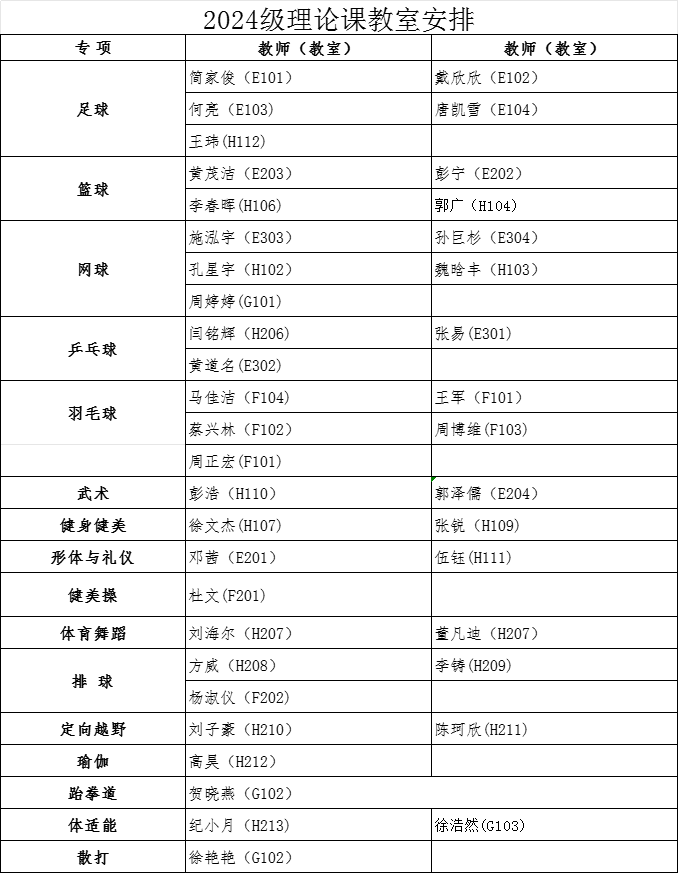 经教务处同意,本学期2024级本科生第3周体育课为九游在线(中国)理论课,9月29日起恢复户外教学。根据教室资源状况,现将理论课具体安排通知如下: